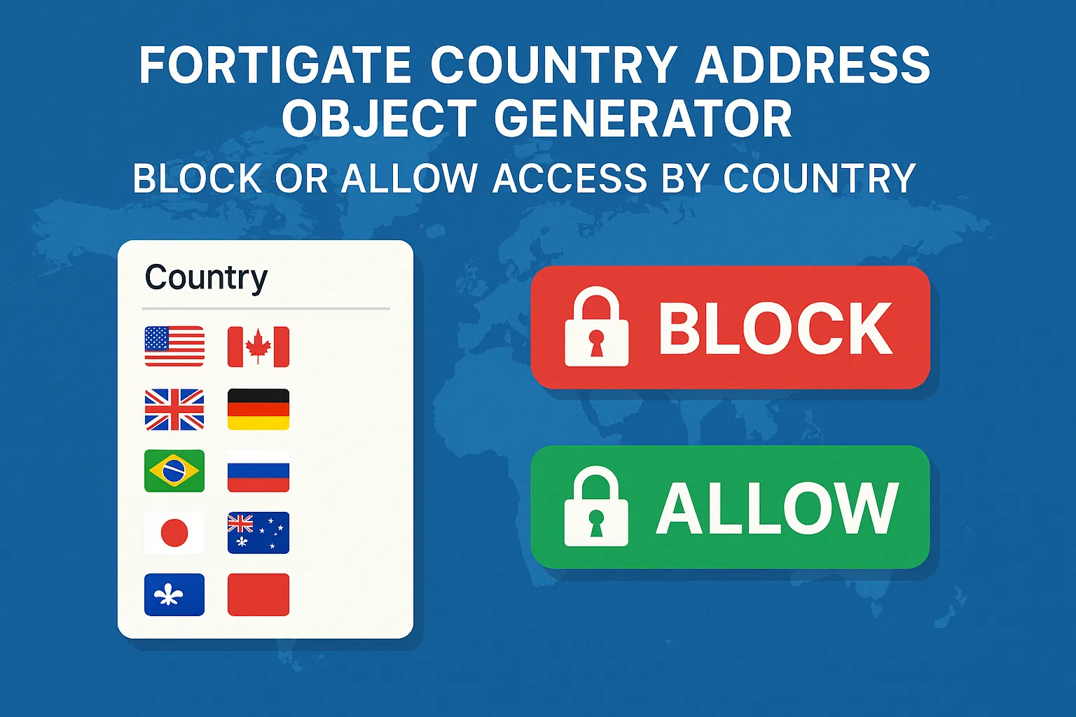 This free web-based generator helps FortiGate administrators automate the creation of geolocation-based firewall address objects quickly and efficiently. No installation, no login, and no data collection — all actions happen locally in your browser.
