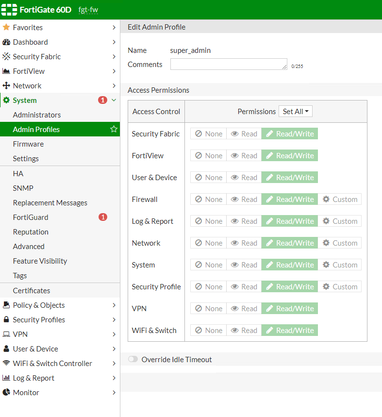 In addition to the default admin profiles, FortiGate allows administrators to create custom profiles tailored to their organization’s specific needs. This flexibility provides granular control over what actions users can perform, ensuring that each administrator has the appropriate level of access.